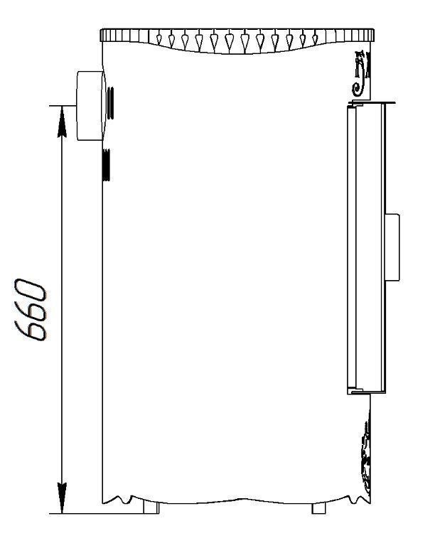 Топка выполнена из жаростойкой нержавеющей стали AISI 439 толщиной 3 мм. Декоративный кожух тоже стальной, украшен узором, вырезанным лазером. В конструкции печи применена технология подового горения. Благодаря отсутствию колосника заложенные дрова сгорают полностью. Золы остается мало, чистить топку после каждого использования не требуется.