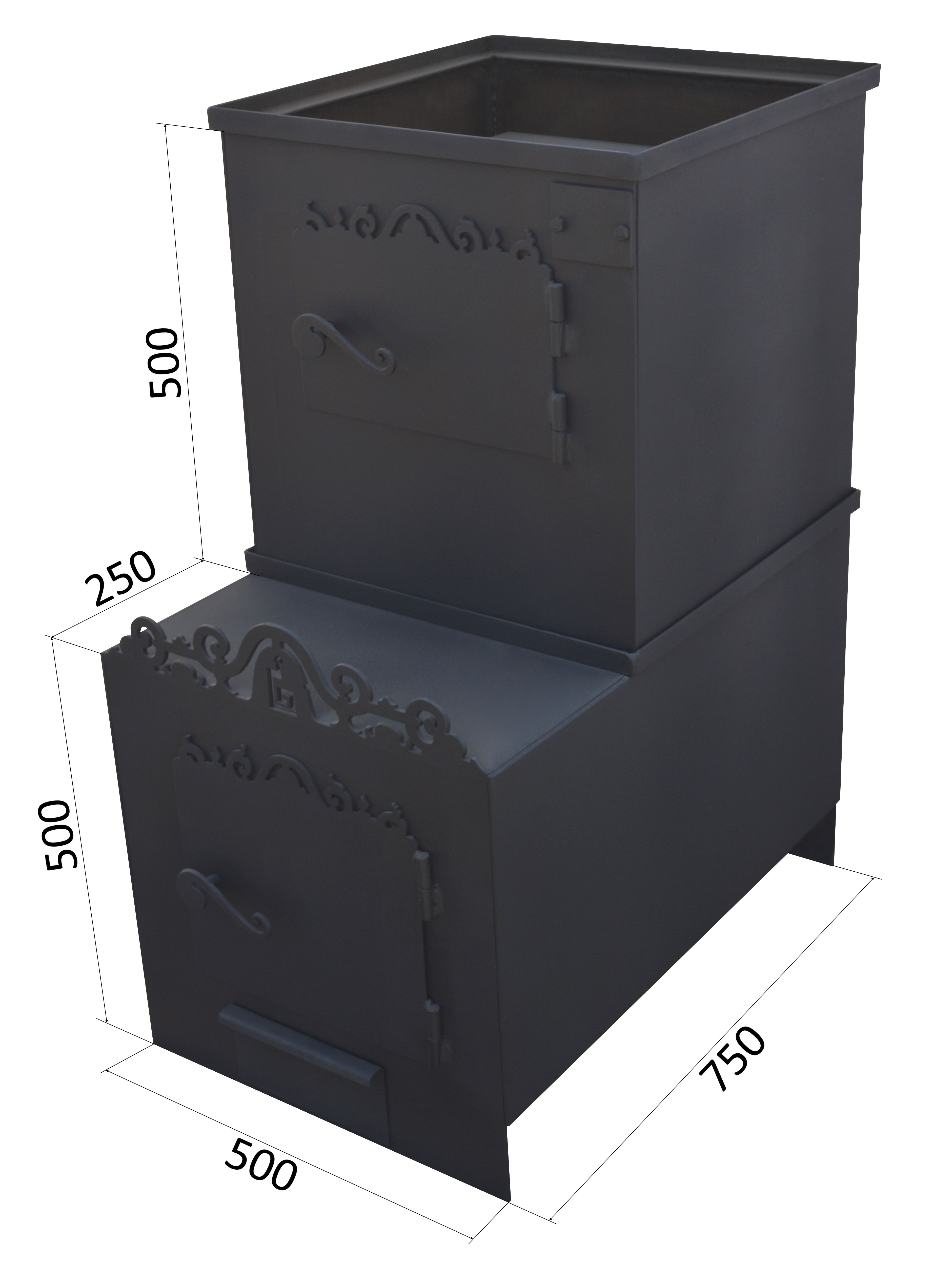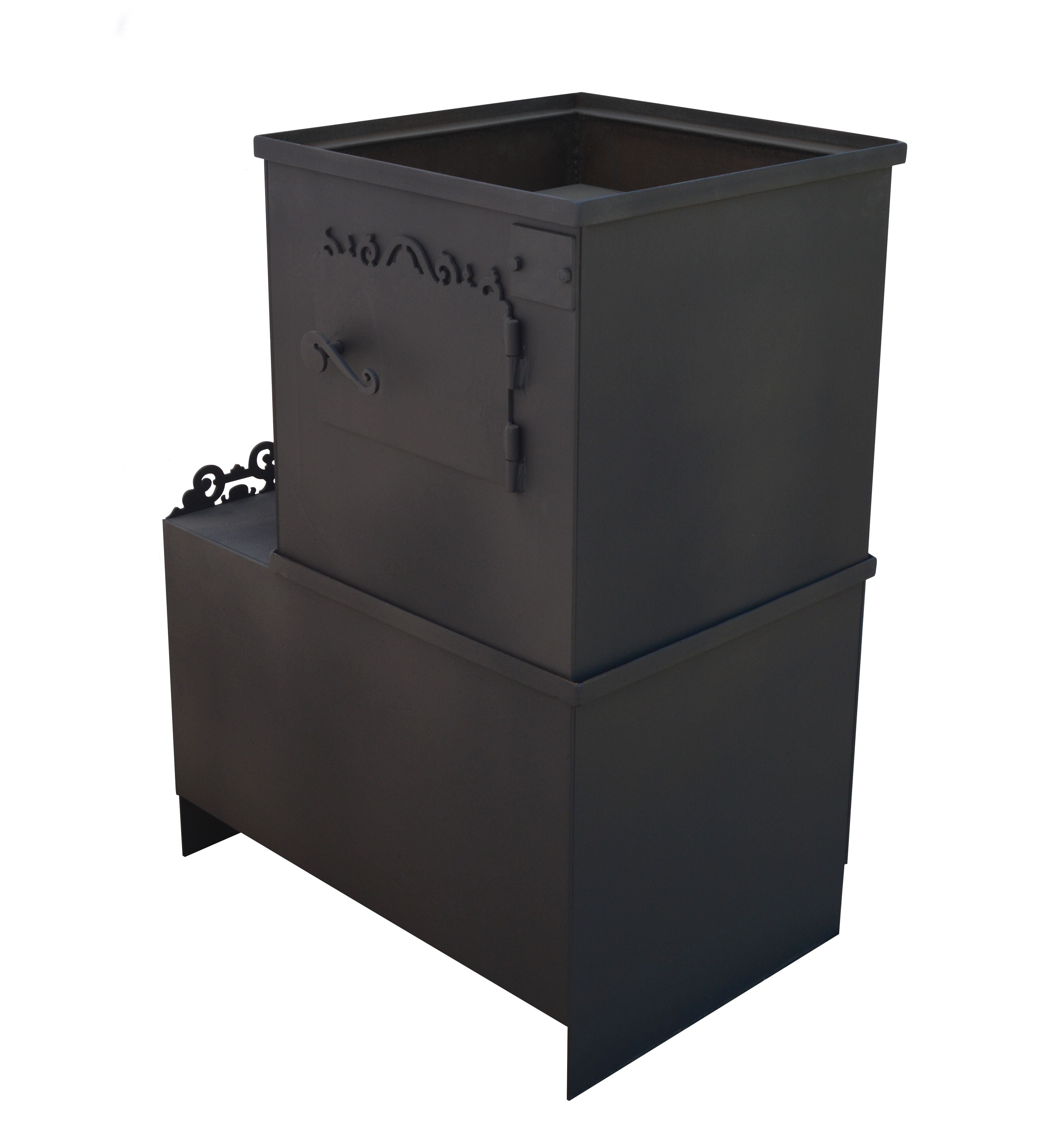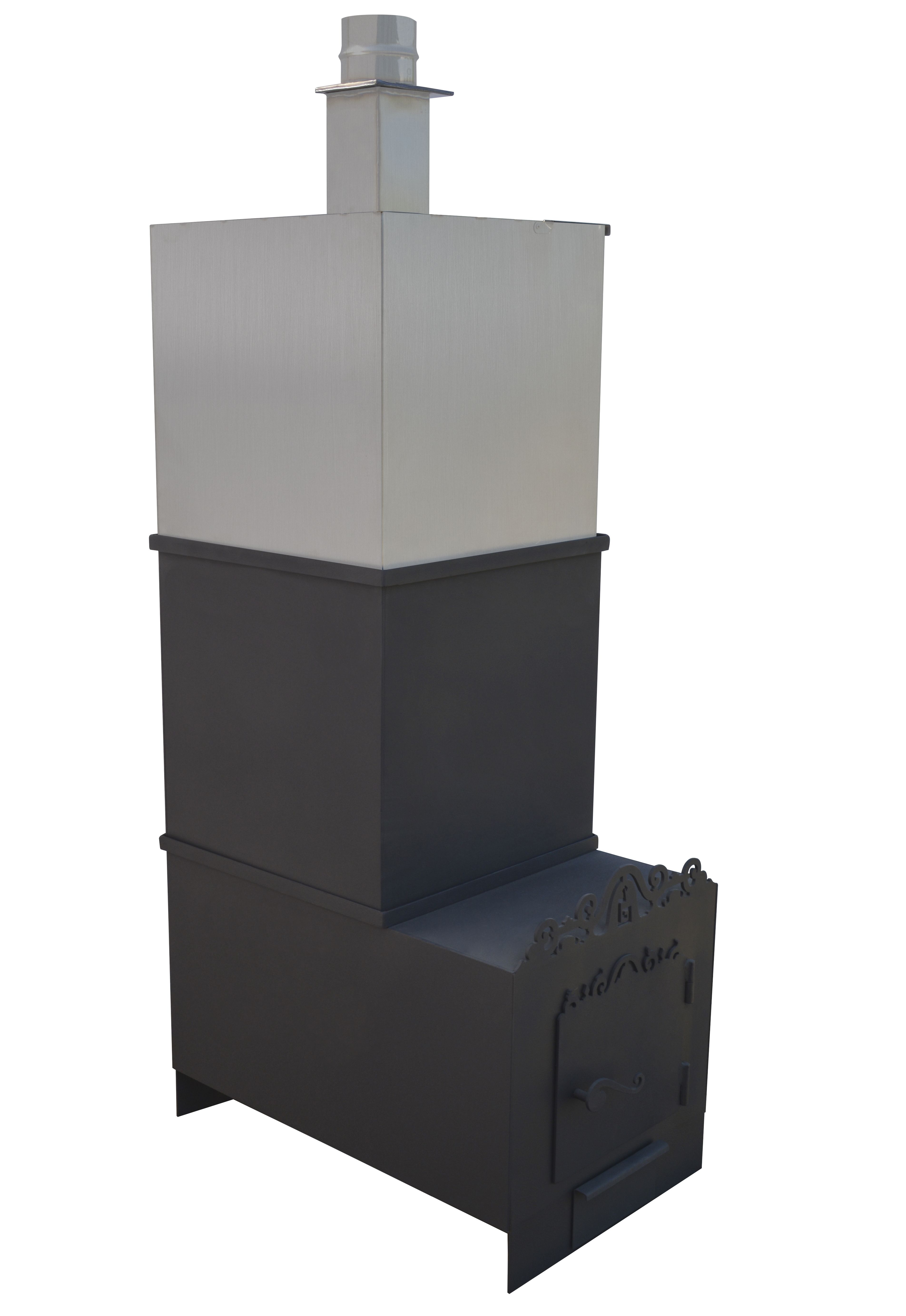 Печь "Вертикальная с выступом" состоит из трех блоков (устанавливаются в четырех положениях) собираемых на месте монтажа: топка, каменка, бак для горячей воды самоварного типа (бак приобретается отдельно). Печь изготовлена из металла толщиной 5 мм, дно каменки - 8 мм. Конструкция печи изготовлена таким образом, что пламя огибает со всех сторон закрытую каменку, тем самым нагревает камни максимально эффективно, затем горячие газы и дым поступают в дымосборную камеру под баком и уходят дальше в дымоход нагревая воду максимально быстро.