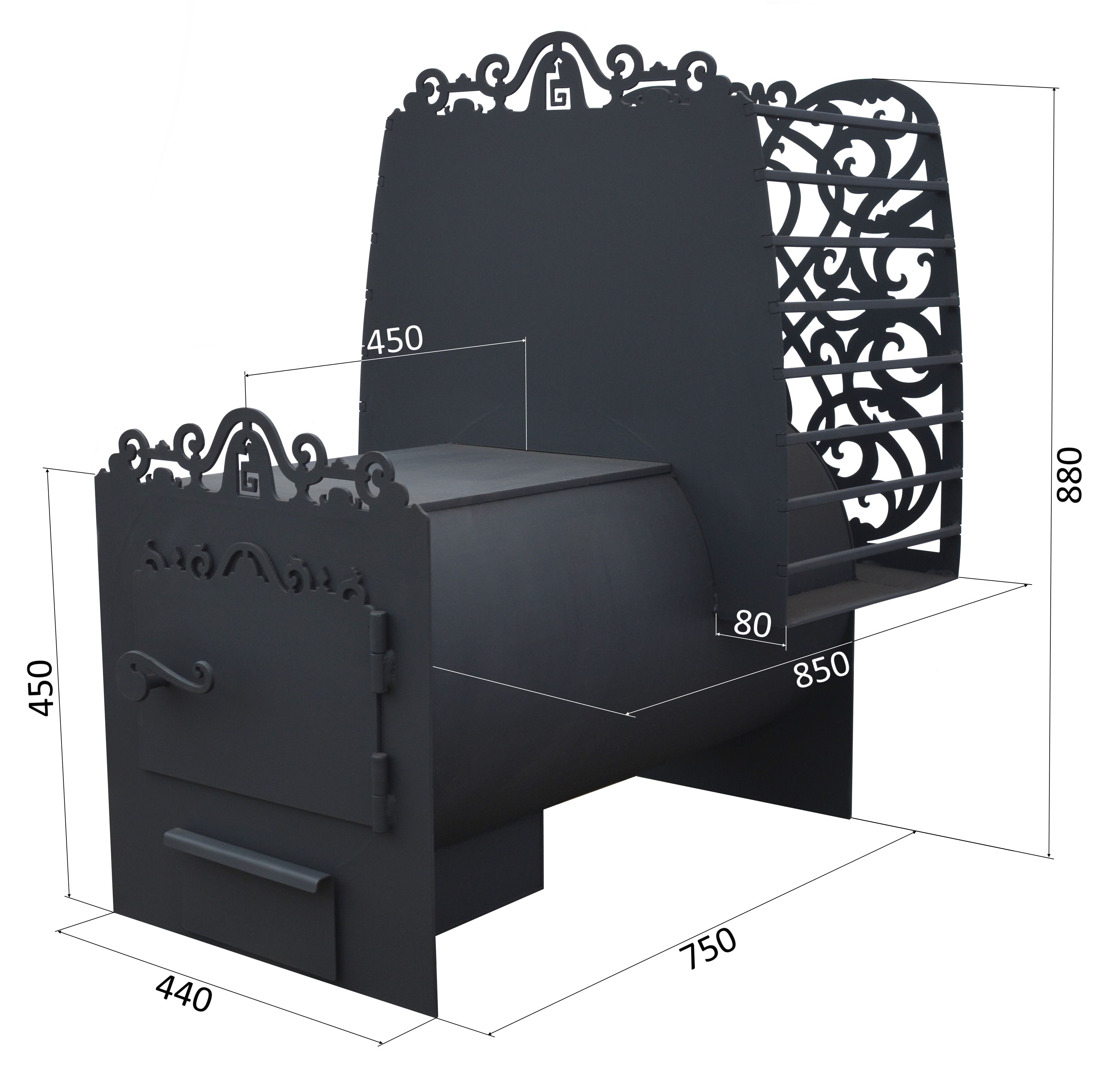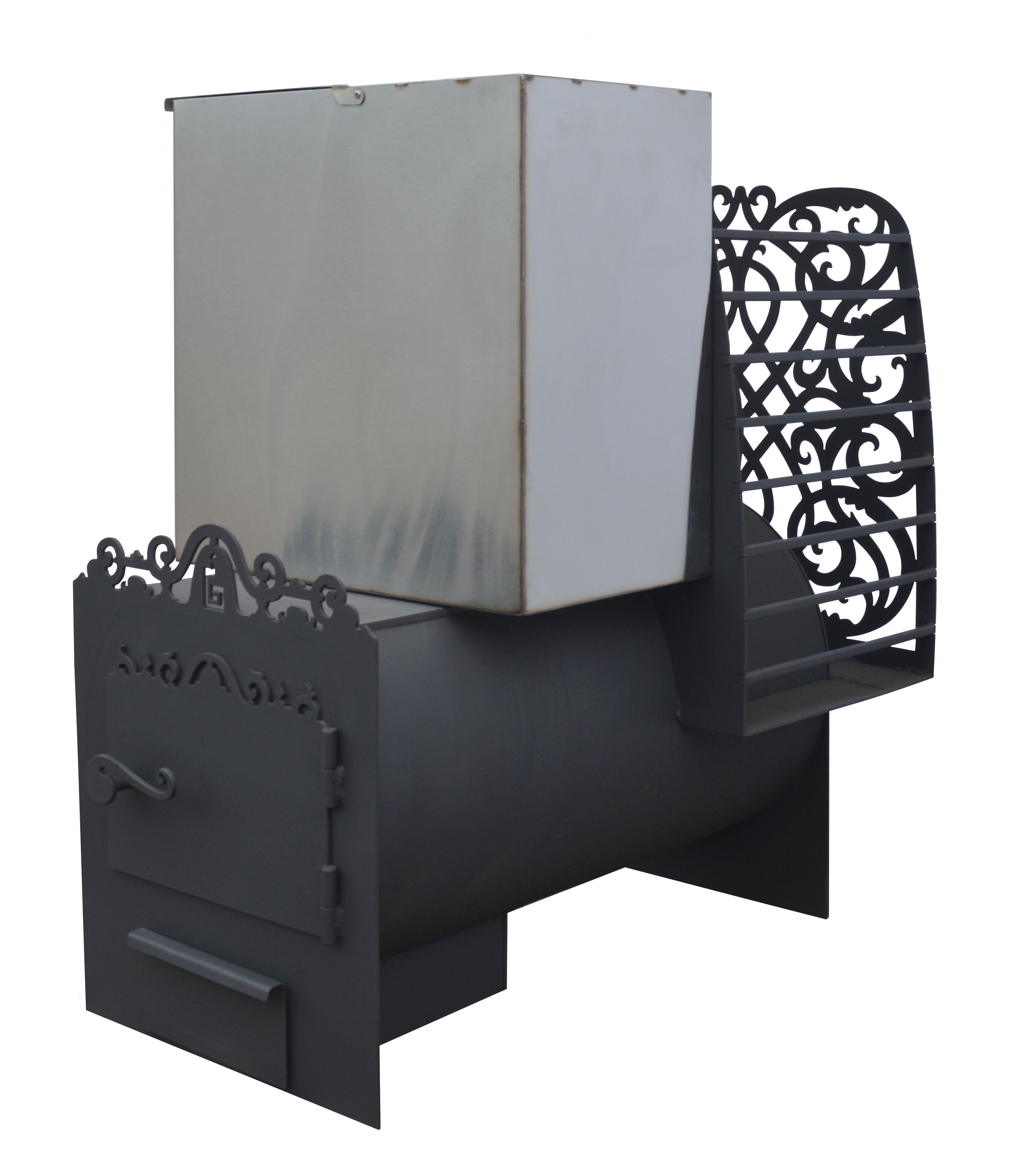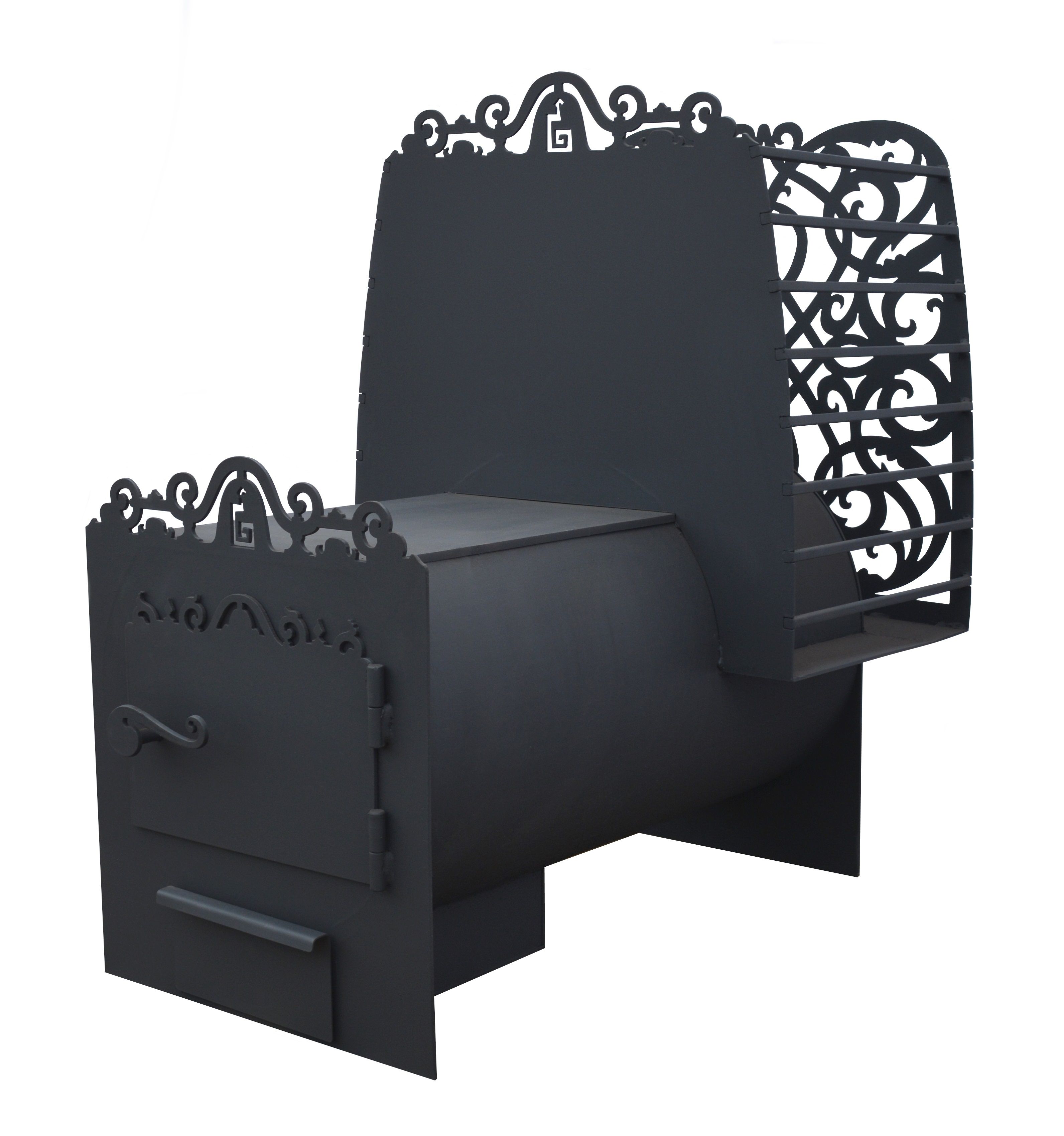 Печь "Горизонтальная-426" состоит из двух блоков: цельносварной топки-каменки и бака для горячей воды (бак приобретается отдельно). Печь изготовлена из листового металла толщиной 8 мм и 5 мм, трубы диаметром 426 мм толщиной 8 мм. Конструкция печи изготовлена таким образом, что пламя изначально прогревает дно бака для горячей воды и каменку, затем за счет отсекателя пламя следует к задней стенке топки, далее разворачивается, поступает в дымосборную камеру и уходит в дымоход. Бак для горячей воды нагревается до оптимальной температуры за счет установки его прямо над топкой печи, верхняя часть которой прогревается до максимальных температур.